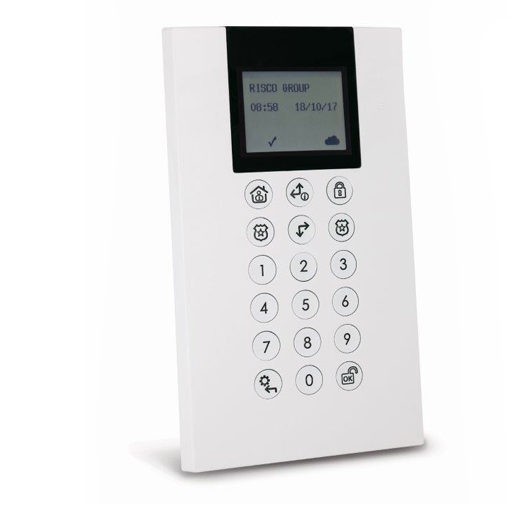 Panneau de commande mural filaire avec clavier rétroéclairé, affichage LCD et LED, permettant l’armement/désarmement, la saisie de code, la gestion des partitions et l’affichage d’alertes, compatible avec les centrales Risco LightSYS et ProSYS.